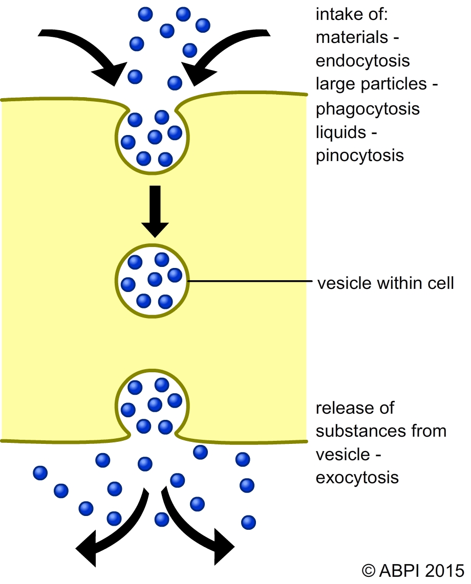 The membrane flows around the large particle and seals it within a membrane-bound vesicle, taking it into the body of the cell. This is known as phagocytosis. A cell may also take in tiny amounts of liquid – this is known as pinocytosis.