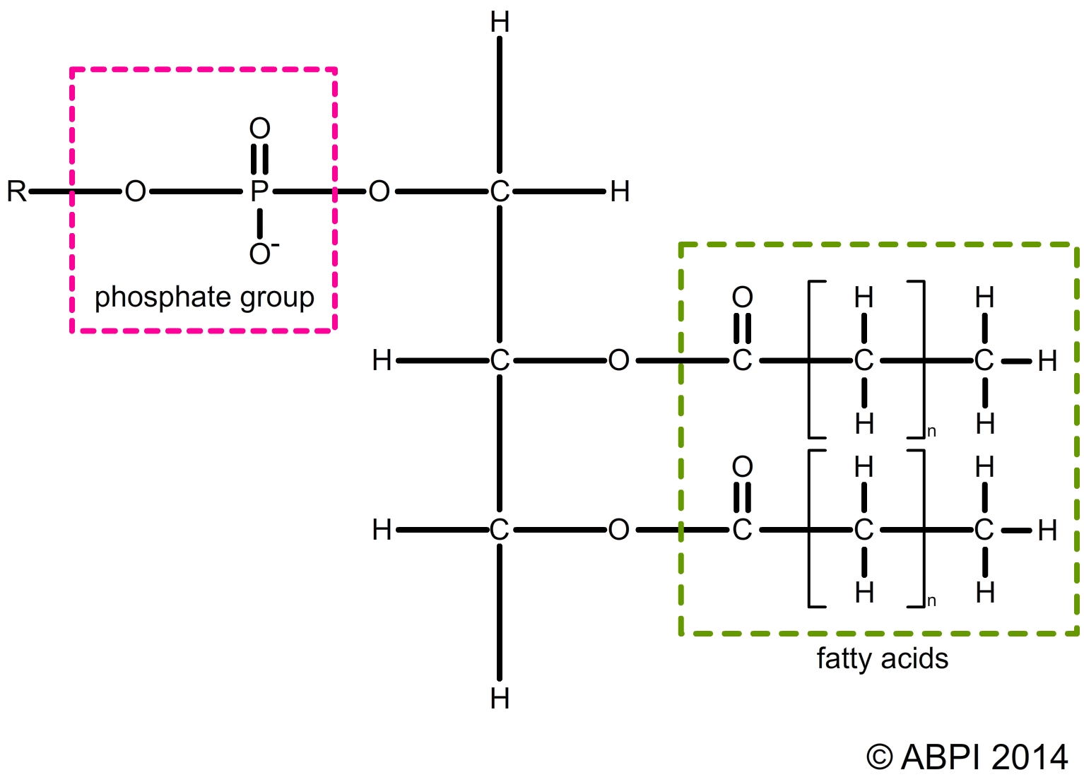 Every cell contains high levels of inorganic phosphate ions (-PO43-). Sometimes one of the fatty acids in a triglyceride is replaced by a phosphate group to form a phospholipid. Phospholipid molecules have a hydrophilic region around the phosphate group which is soluble in water and hydrophobic regions around the fatty acids which are not soluble and repel water. This is a key element in the structure of cell membranes and so in the nature of life itself.