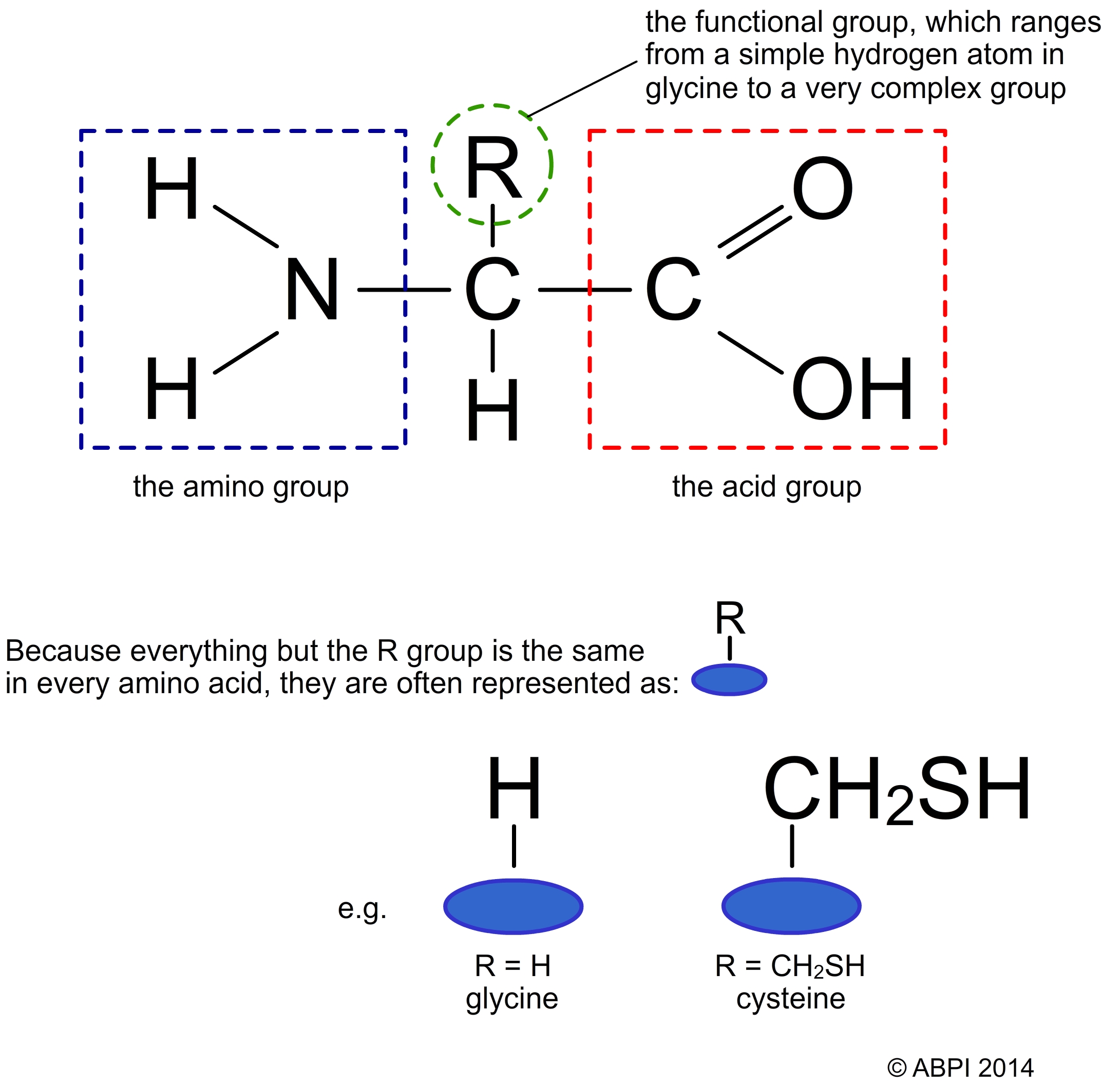 Although the R group is important in the structure of proteins, it is ignored when considering how amino acids join together to form proteins.