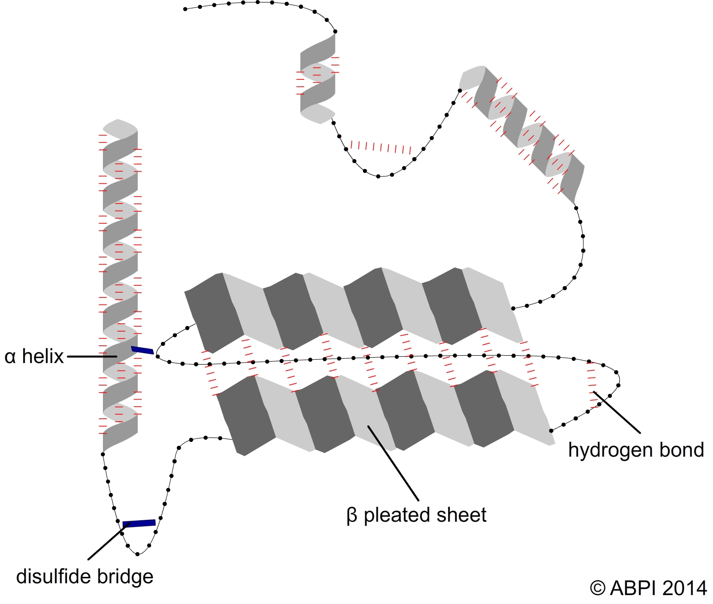 The secondary structures of proteins - α-helices and β pleated sheets – are held together by hydrogen bonds between polar molecules in the backbone of the polypeptide chain. Hydrogen bonds are relatively weak but there are many of them.