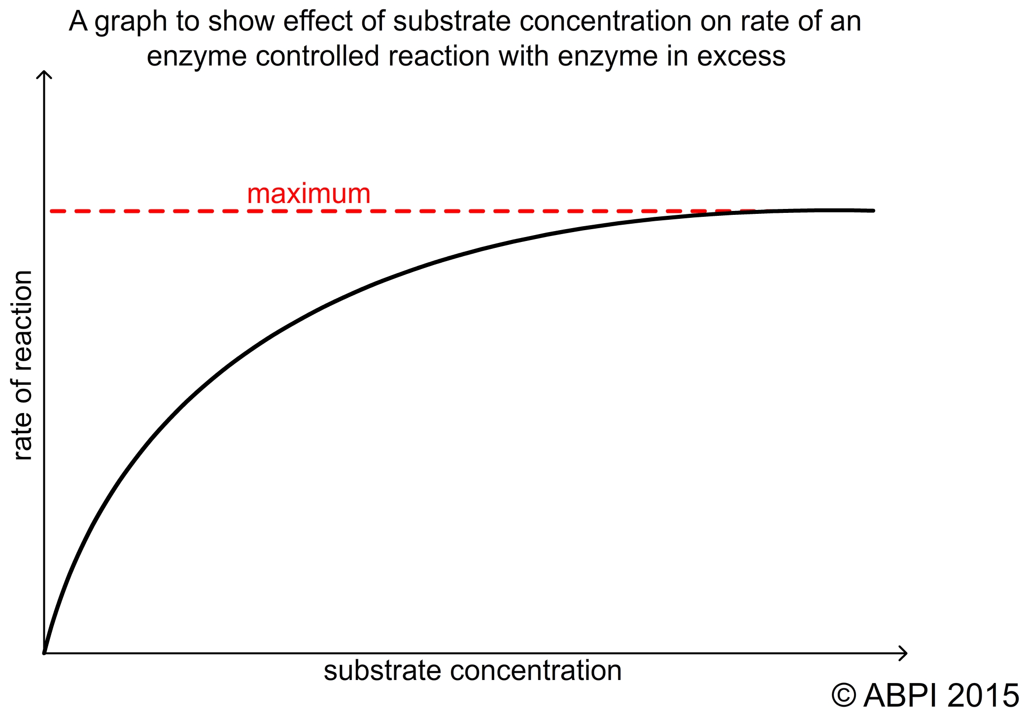 For a given amount of enzyme, an increase in substrate will result in an increase in the rate of reaction. The more substrate molecules there are, the faster the reaction takes place as more of the active sites are used. This continues until the concentration of substrate is so high that all the enzyme molecules are working at their maximum capacity. At this point, however much more substrate is added the reaction will not go any faster.