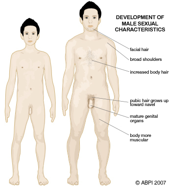 The testes start to produce testosterone which begins the development of secondary sexual characteristics. In boys these are: