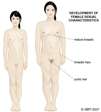 The ovaries start to produce oestrogen and progesterone which begin the bodily changes that happen during puberty. The changes, known as secondary sexual characteristics, are: