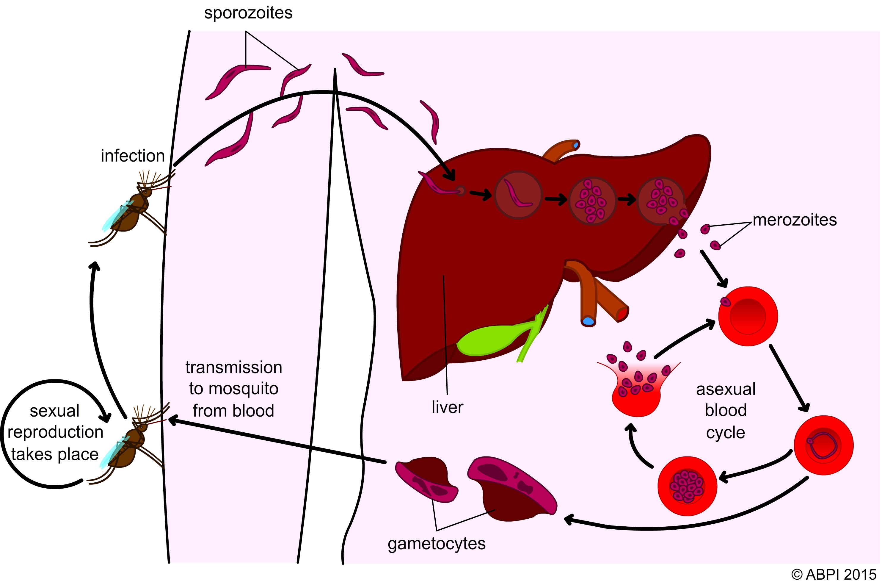 The malaria parasite has a complex life cycle and requires development inside a mosquito and a human host. Mosquitoes carry infectious parasites in their salivary gland. When they bite a person to feed on their blood, they will inject thousands of sporozoites into their bloodstream. These then invade the liver where they mature and multiply into thousands of merozoites, which will invade host red blood cells.