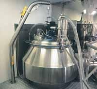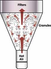 The granules are dried in a fluid bed drier. This has a large fan facing upwards. It creates giant currents of heated air. The air picks up the granules and carries them up in a warm flow. The granules fall down and are picked up by more hot air.