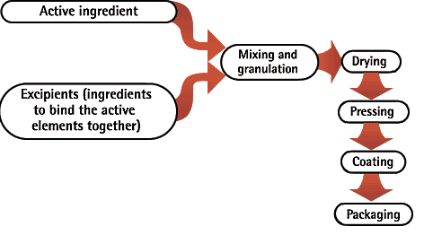 The first stage of making a medicine is to manufacture the active ingredient.We call this stage the primary manufacture.The active pharmaceutical ingredient (API) will normally make up a small proportion of the final medicine. However this is the part that will treat the disease.